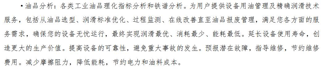油品分析:各類工業油品理化指標分析和鐵譜分析。為用戶提供設備用油管理及******潤滑技術服務,包括從油品選型、潤滑標準優化、過程監測、在...